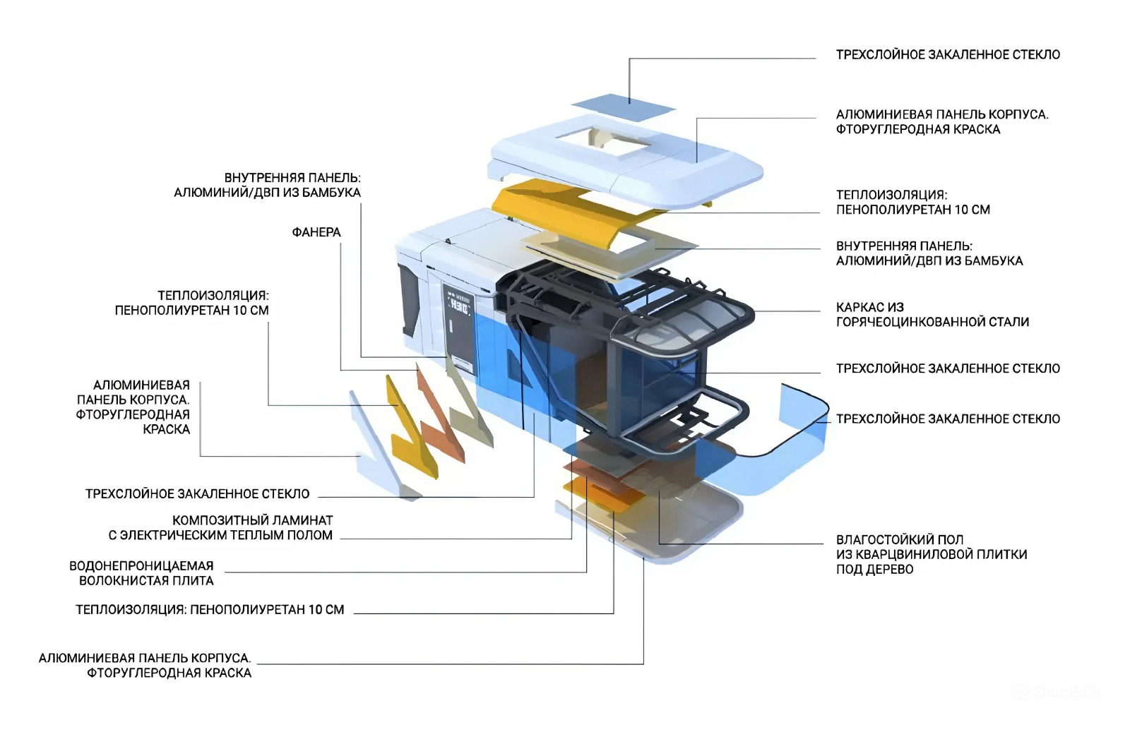 Каркас выполнен из горячеоцинкованной стали, отделка из алюминИевых панелей. Внутри стен используется энергоэффективный утеплитель - напыляемый пенополиуретан в закрытой ячейке.