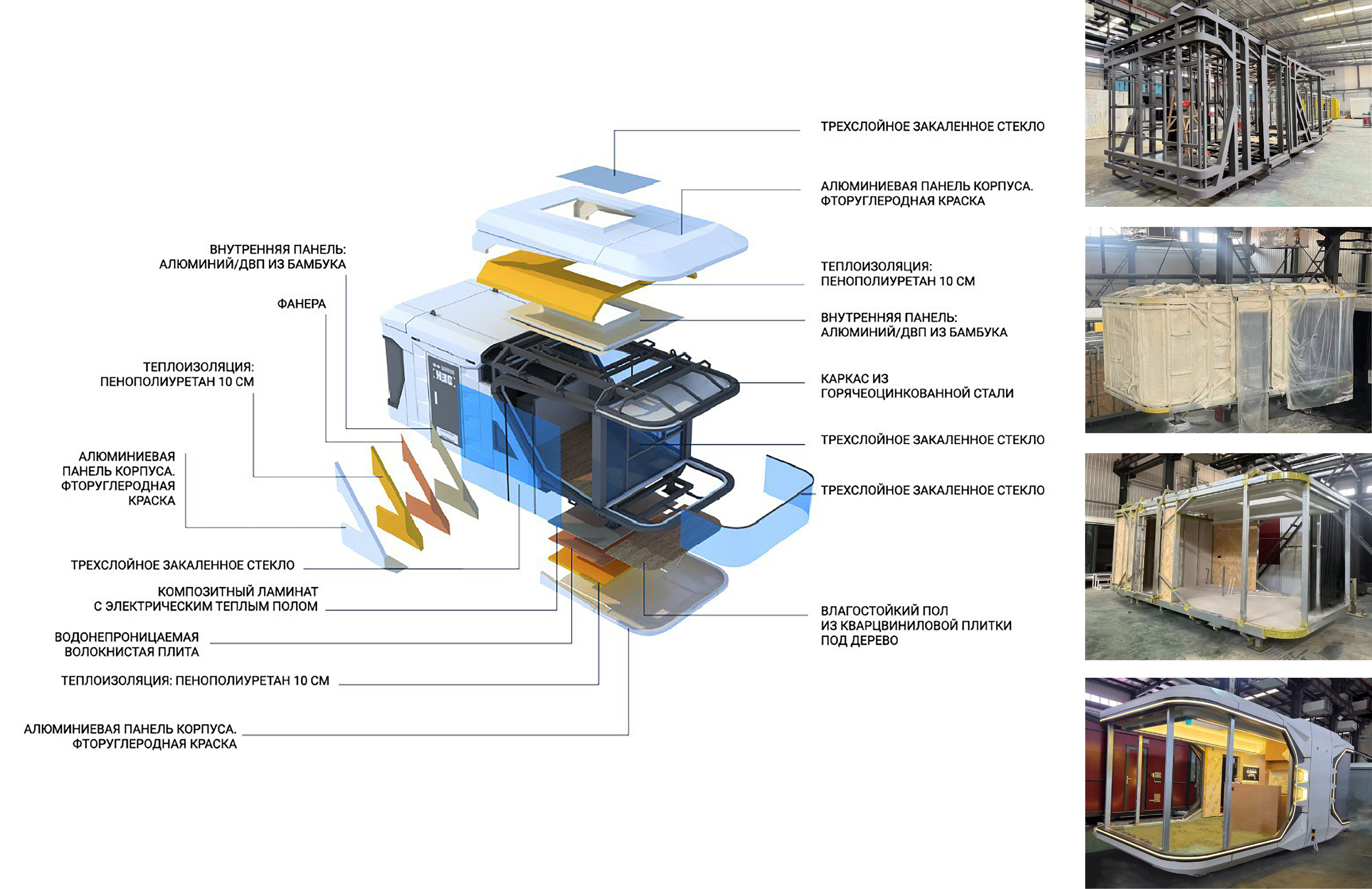 Каркас выполнен из горячеоцинкованной стали, отделка из алюминиевых панелей. Внутри стен используется энергоэффективный утеплитель - напыляемый пенополиуретан в закрытой ячейке.